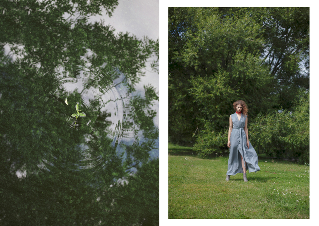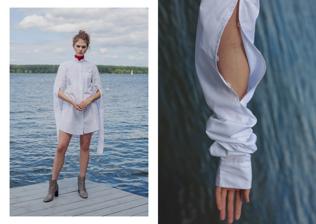 О том, что скоро мультибренд запустит и собственную марку, объявили в это же время — и в той самой первой съемке уже принимали участие их рубашки и брюки. Но полный лукбук первой коллекции On Course появился только осенью. На этот раз за камеру взялась Маша Демьянова, а стилизовала съемку команда мультибренда своими силами. И результат получился ничуть не менее ярким — и даже более художественным. Кадры с участием довольно простых (напомним, что специализируется марка в первую очередь на базовой одежде — об обещанных сюрпризах поговорим чуть позже) вещей комбинируются с пейзажными снимками и взятыми крупным планом природными фактурами. Речная гладь, бегущие по воде круги от упавшей ветки, поросшая мхом древесная кора в трещинах, редкие деревца, торчащие из такой же редкой травы, — скромным образам очень идут такие же скромные фотозарисовки российской природы.