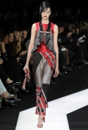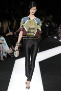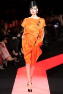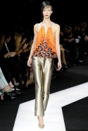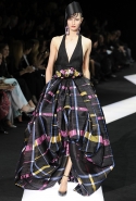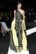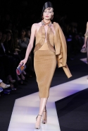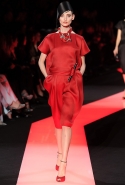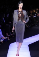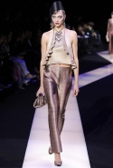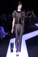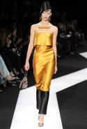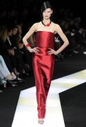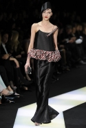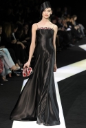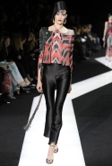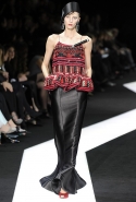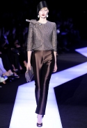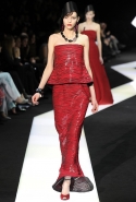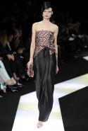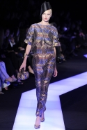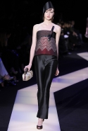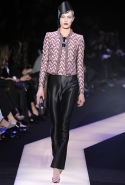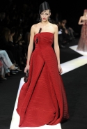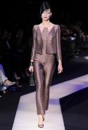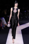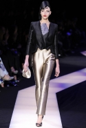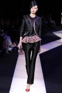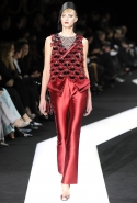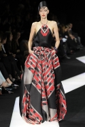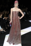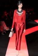 В этот раз при работе над новой кутюрной коллекцией Джорджио Армани обратил свой взор в сторону Востока. Насыщенный красный и "шафрановый" желтый, юбки и платья, надетые поверх брюк, укороченные жилеты и шляпы-фески — образ, вдохновленный яркой и колоритной культурой городов Марракеш и Стамбул. Сочетая восточную тематику с элементами ар-деко, дизайнер выводит моделей на подиум в традиционных для себя брючных костюмах из струящихся атласных тканей. Отличие в том, что в этот раз, как сказал сам Армани, "в коллекции нет места пиджакам мужского кроя", — скорее наоборот, приталенные жакеты и узкие брюки подчеркивают женственный силуэт моделей. Во всем остальном прослеживается привычный для марки стиль: даже заключительная часть, состоящая из платьев в пол из летящего шелка, выглядит минималистично за счет геометричных принтов, строгих форм и контрастного сочетания черного и красного.