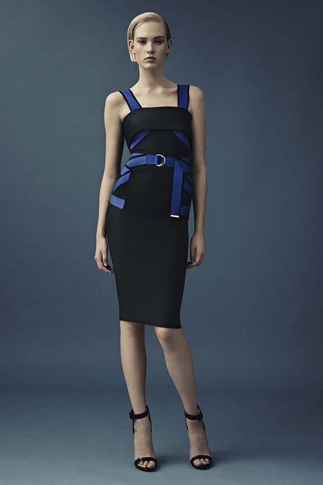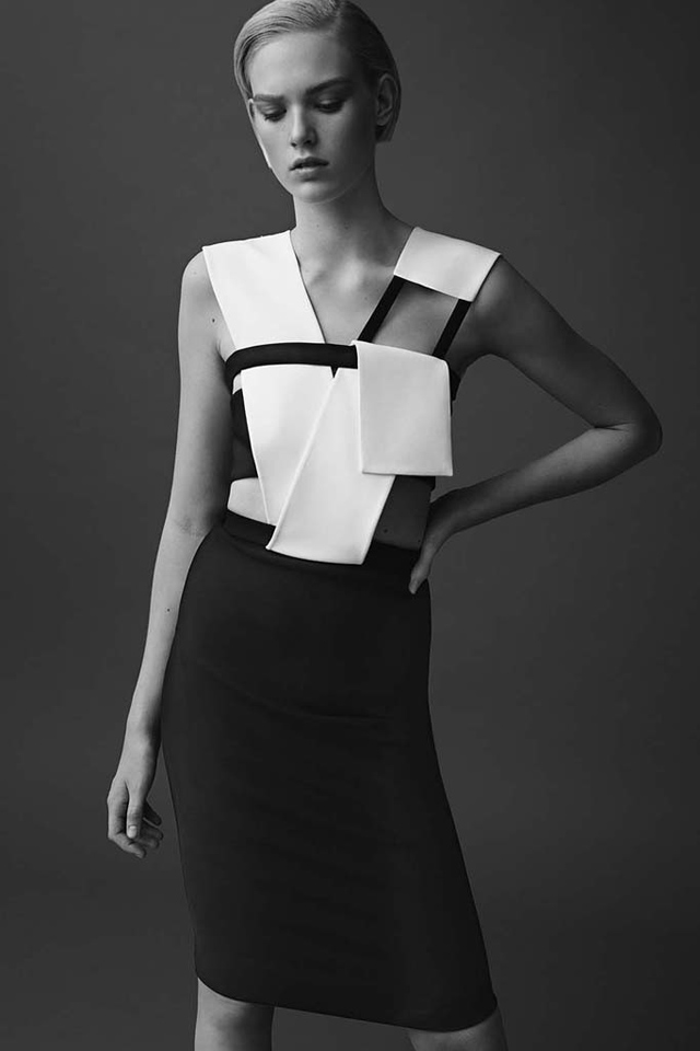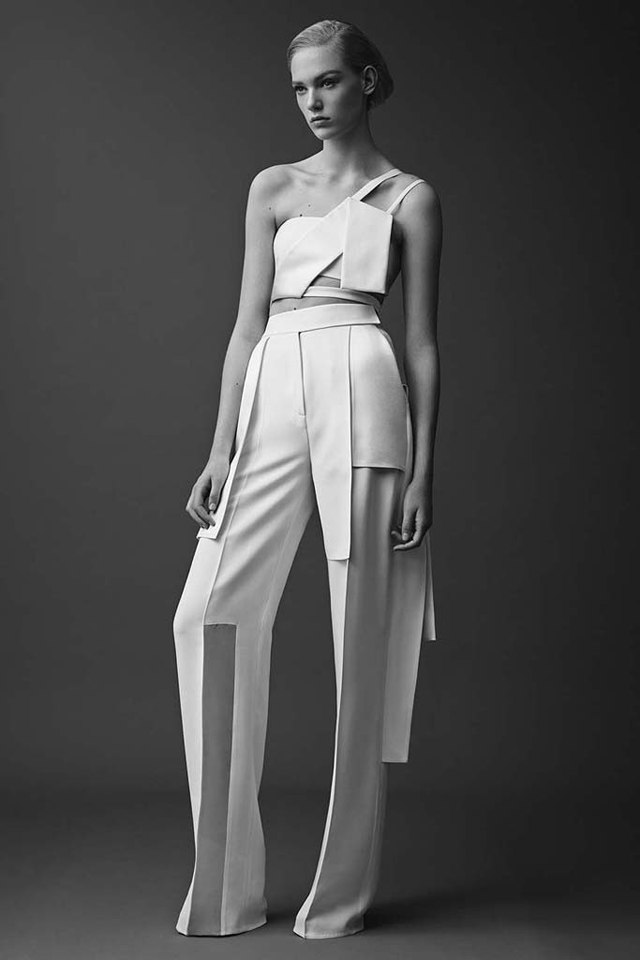Вещи, несмотря на максимально женственные силуэты и очевидную сексуальность, очень графичны, будто собраны из разноцветных панелей или блоков — в них больше от архитектурного модернизма, чем от скульптуры с ее плавными линиями. Платья-футляры перетянуты контрастными ремнями и горят яркими геометричными вставками, которые к тому же отступают от туго утянутых тел, как балконы от стен уходящих ввысь зданий. Даже брюки на талии, ниспадающие складками к самому полу, собраны из слоев тех же панелей и кажутся даже слишком объемными, чтобы считаться просто предметом одежды.