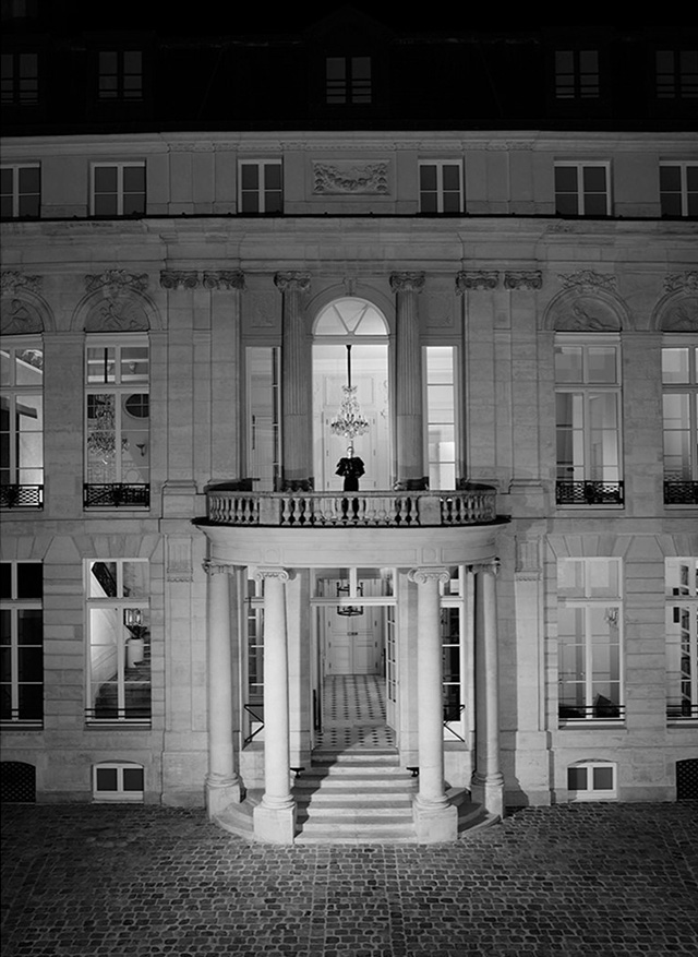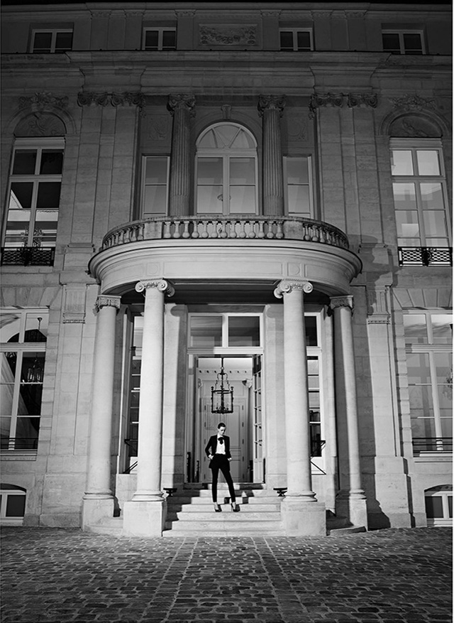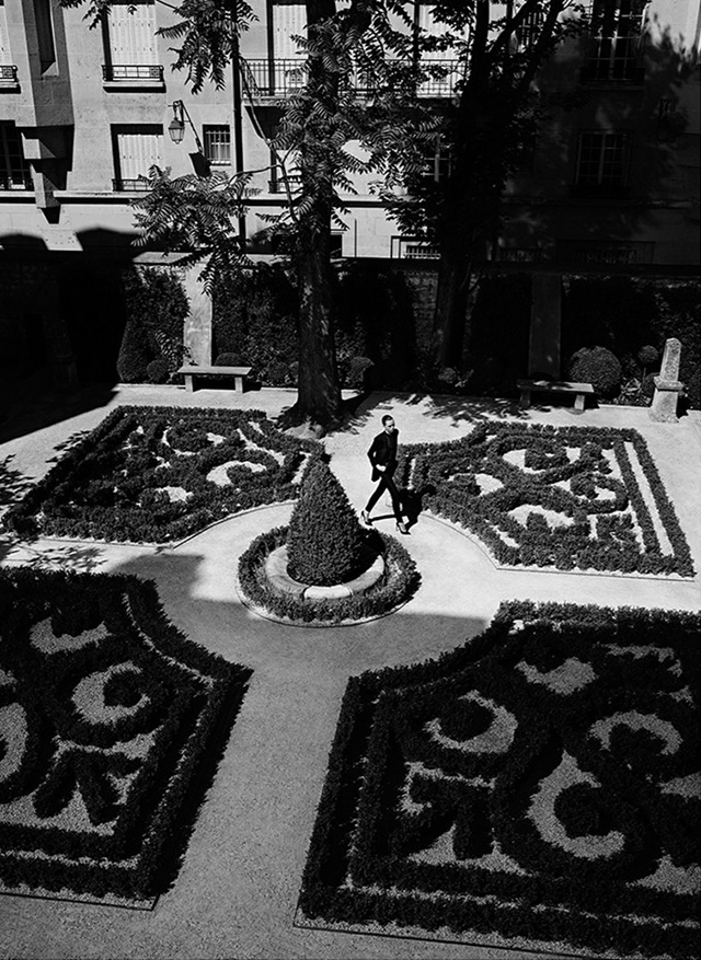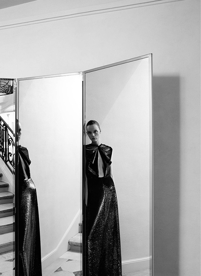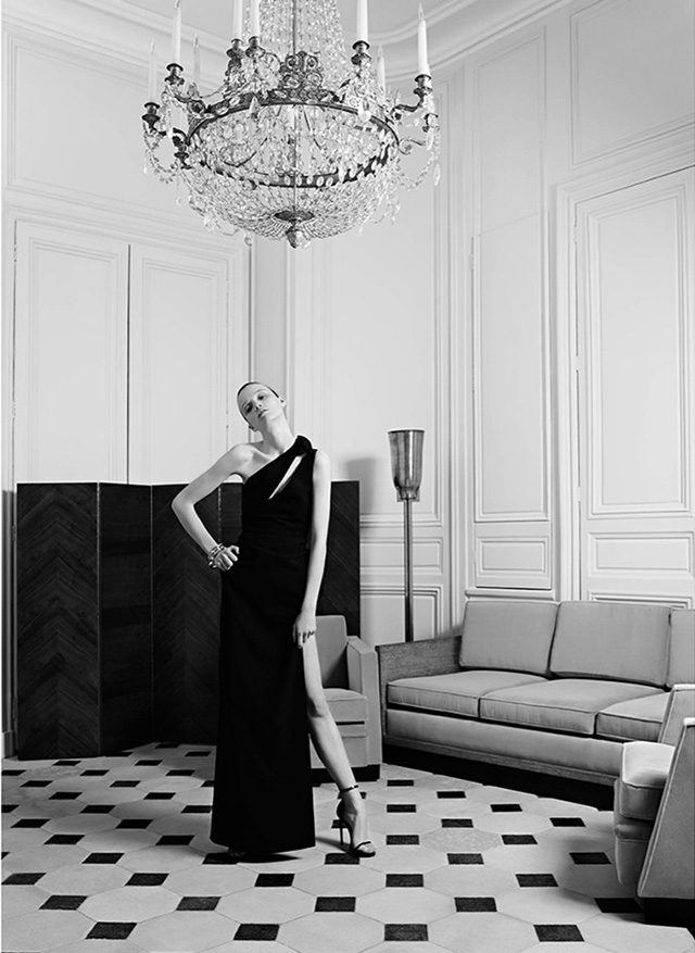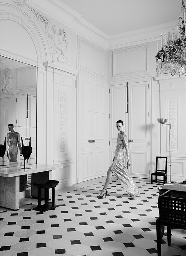 И вот он, результат — рекламная кампания дебютной линии в новом ателье Yves Saint Laurent. Декорациями для моделей в нарядах из коллекции haute couture стали предметы интерьера (в том числе и антикварная люстра из личной коллекции Слимана), фасад особняка и геометрический сад.