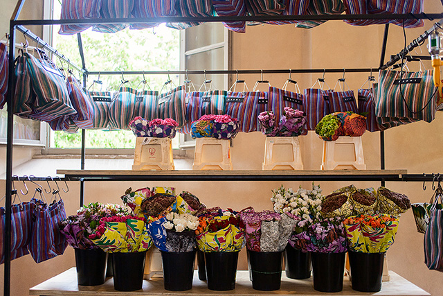 Гостей ярмарки на входе встречали плетеные фигурки животных, сделанные руками бывших колумбийских заключенных, — это продолжение серии скульптур, показанных Marni на Salone del Mobile этого года. А внутри "собора", сверху напоминающего крест, расположился сам цветочный базар, где помимо букетов, обернутых в бумагу с принтами из архивов марки, можно было обнаружить семена, всевозможные безделушки и фартуки Marni Flower Market, расписанные вручную в Замбии.
