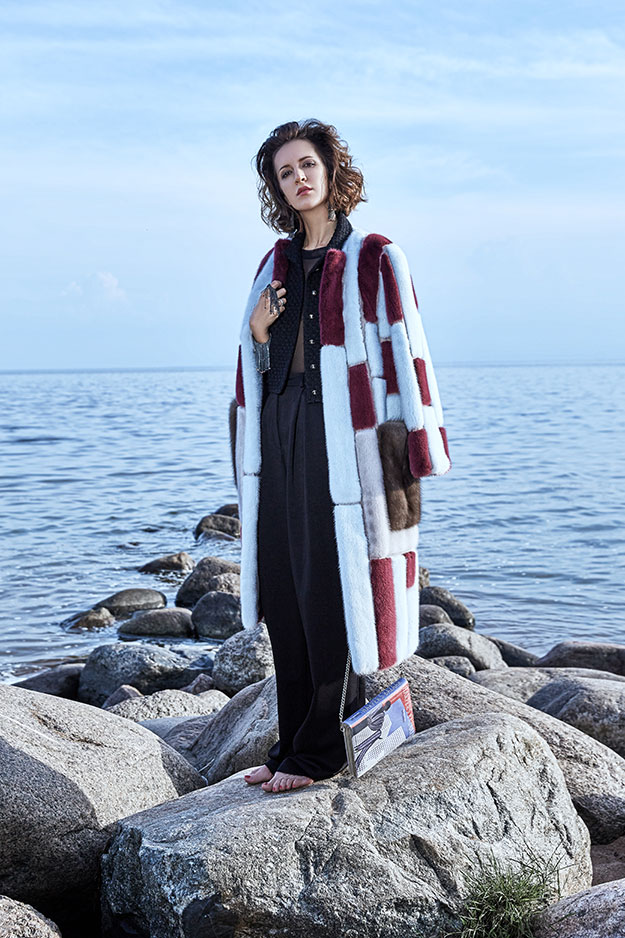 Для съемки Шнурова примерила платья Yakubowitch и шубы Emil Shabaev, которые дополнили ювелирные украшения Dzhanelli Jewellery и клатчи Foliant.