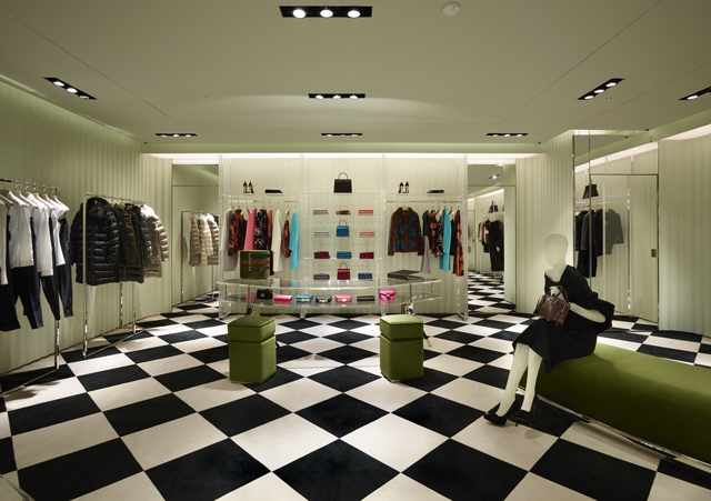 Новый магазин оформлен в стиле, уже ставшем визитной карточкой бутиков бренда: шахматный черно-белый пол, обтянутые зеленой тканью стены со встроенными дисплеями-нишами. Дополняют интерьер бархатные зеленые диваны и столики из плексигласа и стали. А во втором зале, где представлена женская коллекция одежды, с помощью чуть приглушенного света создана более мягкая, интимная атмосфера.