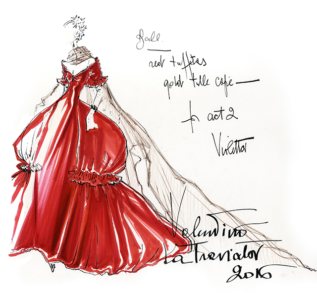 О том, как прошла премьера (спойлер: с овациями) мы уже рассказывали, поэтому теперь сосредоточимся на костюмах. Сам Валентино Гаравани, основатель знаменитого дома, создал четыре платья для главной героини Виолетты. И собственно с Викторианской эпохой, во время которой и разворачивается сюжет постановки, связаны они не слишком явно. Гораздо ярче читается стиль самого дизайнера, чем историческая принадлежность. Например, он везде старается добавить немного красного — ведь это фирменный цвет Валентино Гравани и дома, который он построил. О желании сделать своих героинь более современными говорила сама Коппола: ради личного взгляда она с радостью готова была пожертвовать историзмом.