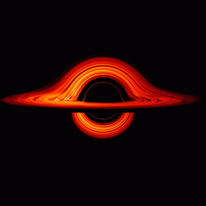 На визуализации можно увидеть так называемый аккреционный диск, который представляет собой оранжевый свет от раскаленного вещества, захваченного мощной гравитацией. Из‑за нее свет сильно деформируется, поэтому внешний вид черной дыры заметно искажается.